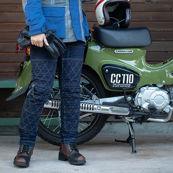 中綿入りのダブルニー部分は凹凸感があり、アタリによるデニムの経年変化も楽しめます。