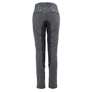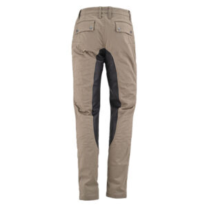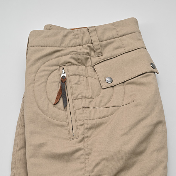 身頃は先染めのコットンツイルストレッチ生地にニーグリップ・シートグリップ補助のため、後ろ身頃内股部分にウォッシャブルレザーを採用した