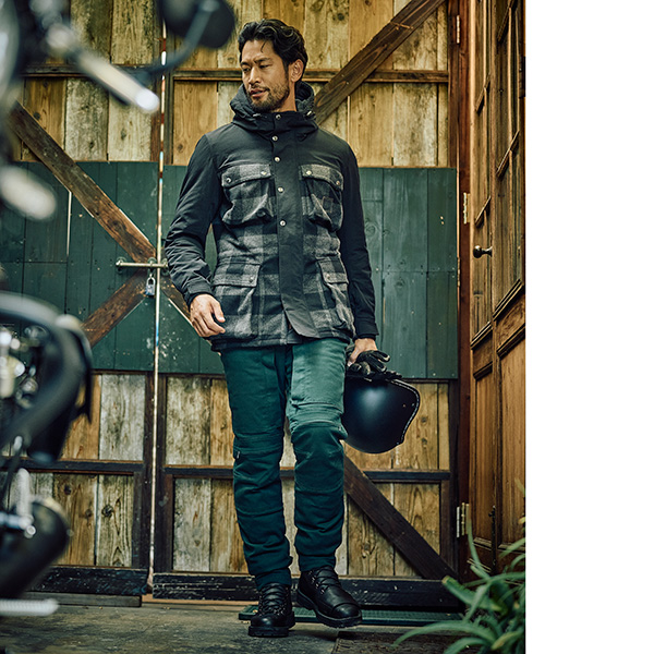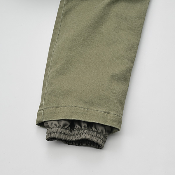 弊社秋冬ボトムでは定番仕様の四重構造(表地→透湿防水防風フィルム→中綿→裏地)で暖かく