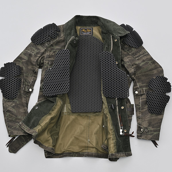 肩・肘・背中・胸に別売りのプロテクターを装着可能。